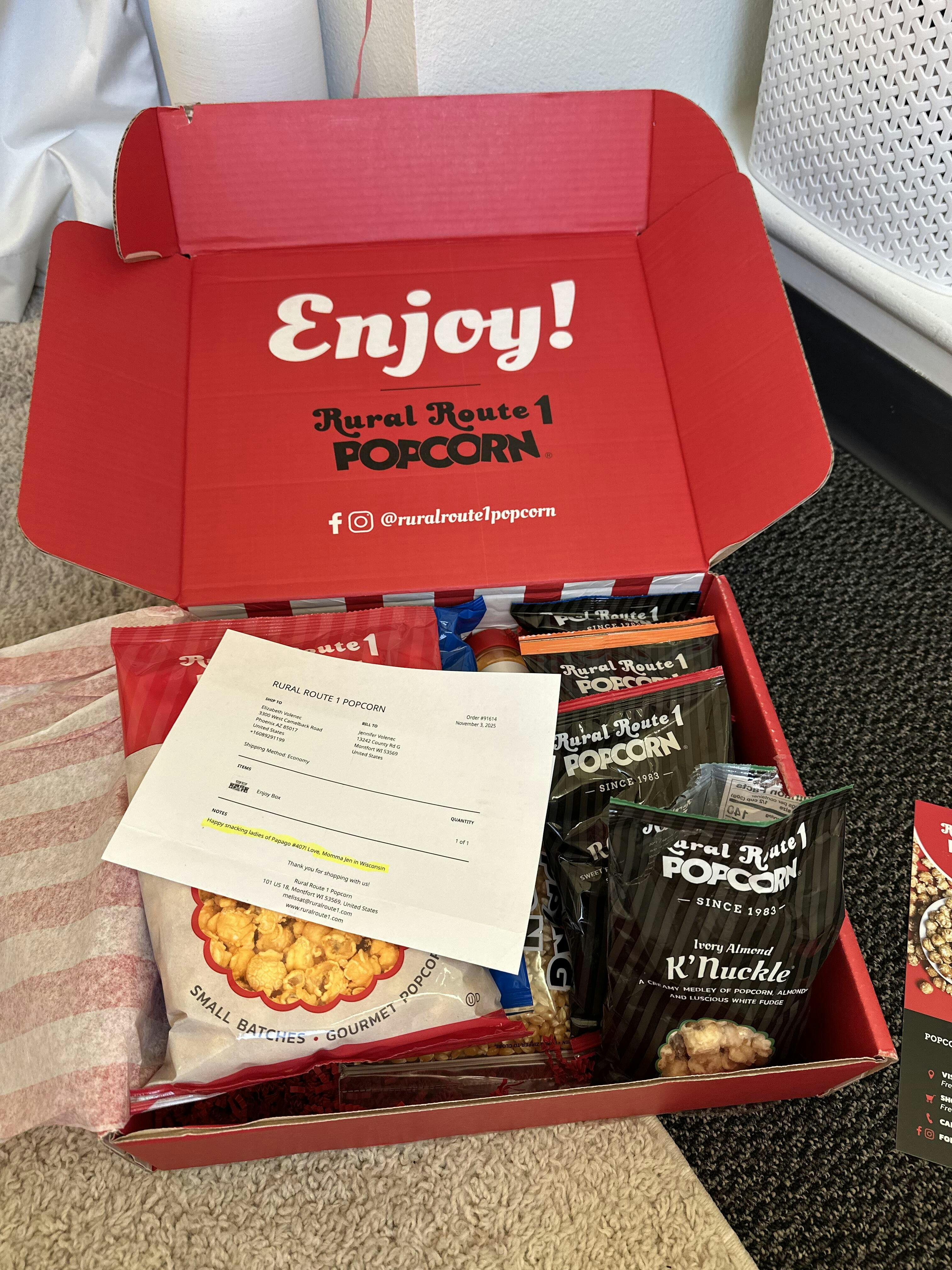 I sent this gift box to my daughter going to college in Arizona; a special treat from WI. She and her three roommates LOVED the popcorn! Thanks RR1!